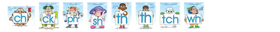 Meet Chocolate Chip (CH sound), Hatch and Scratch (TCH sound), Phone Phil (PH sound), Shushing Shay (SH sound), Thinking Theo (TH unvoiced sound), Theo’s Other Brother (TH voiced sound), and Whistling Whit (WH sound)!